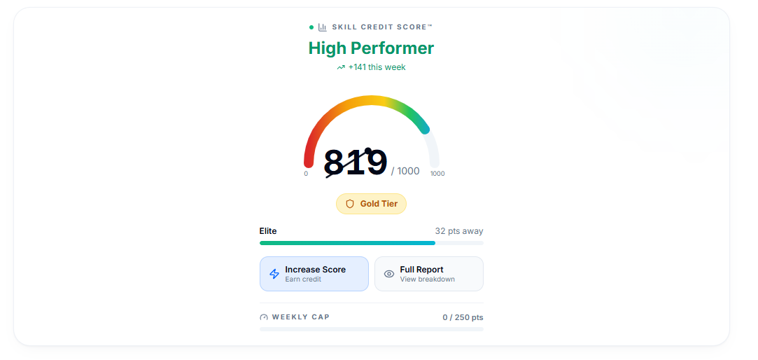 A Skill Credit Score applies the trusted logic of a traditional credit score to your professional skills and competencies.