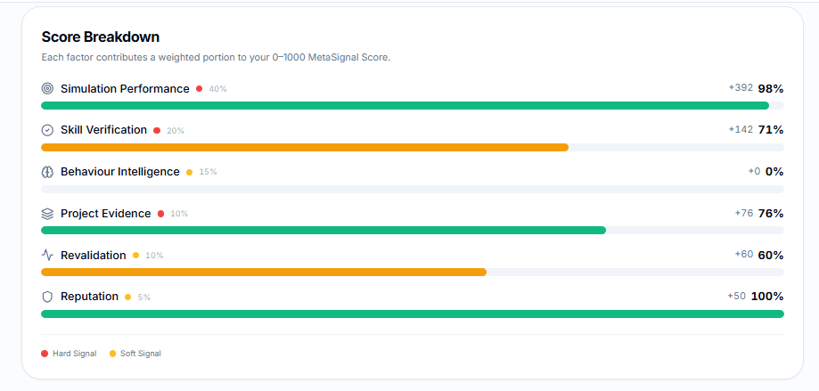 • MetaSignal: Our platform analyses your performance across simulations and verified inputs to generate your Skill Credit Score. It highlights strengths, flags improvement areas, and tracks progress over time.